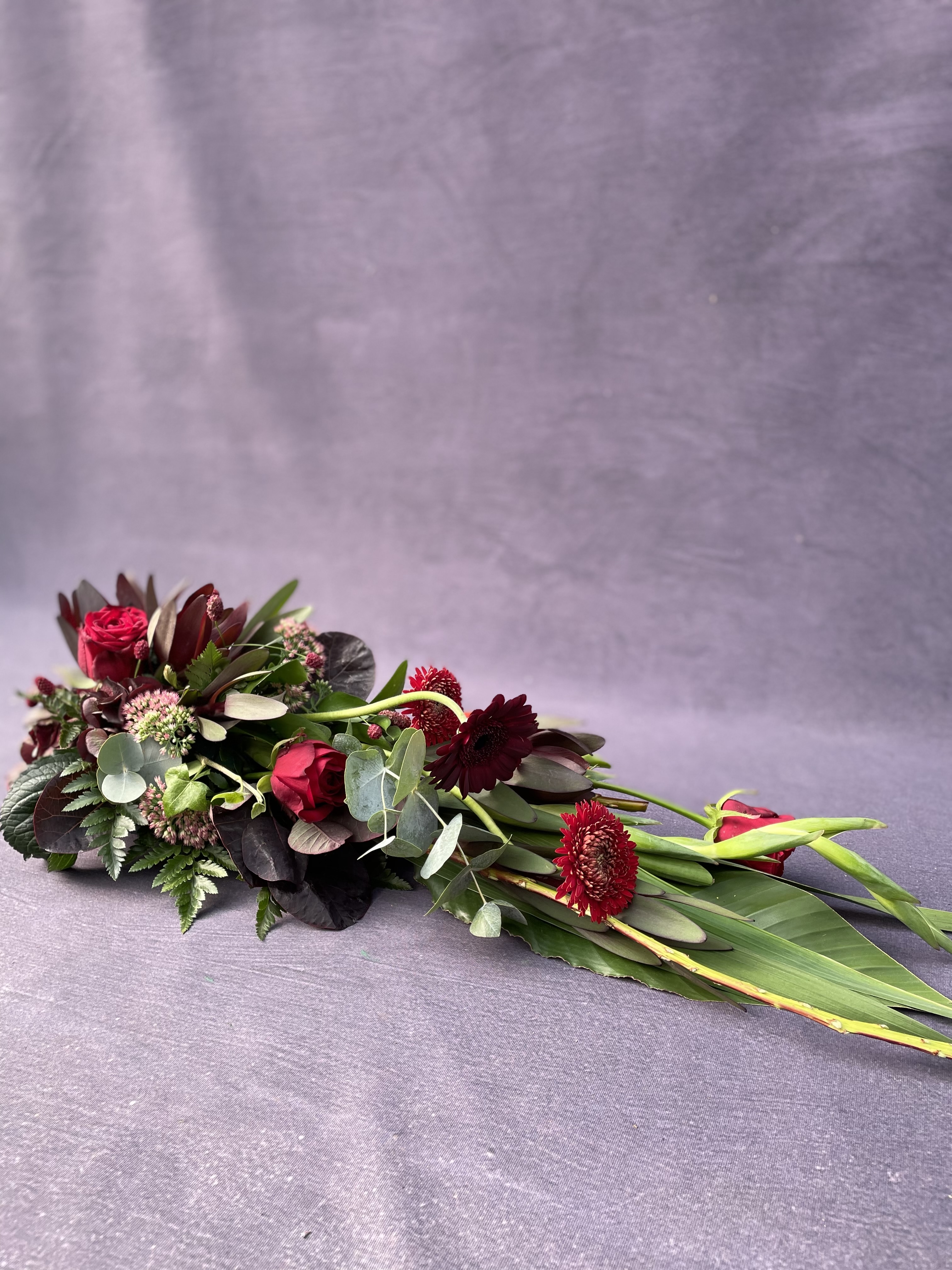 Yndig bårebuket bundet med årstidens smukkeste blomster. Bårebuketten er den klassiske sidste hilsen og anerkendelse som sendes til en begravelse eller bisættelse.