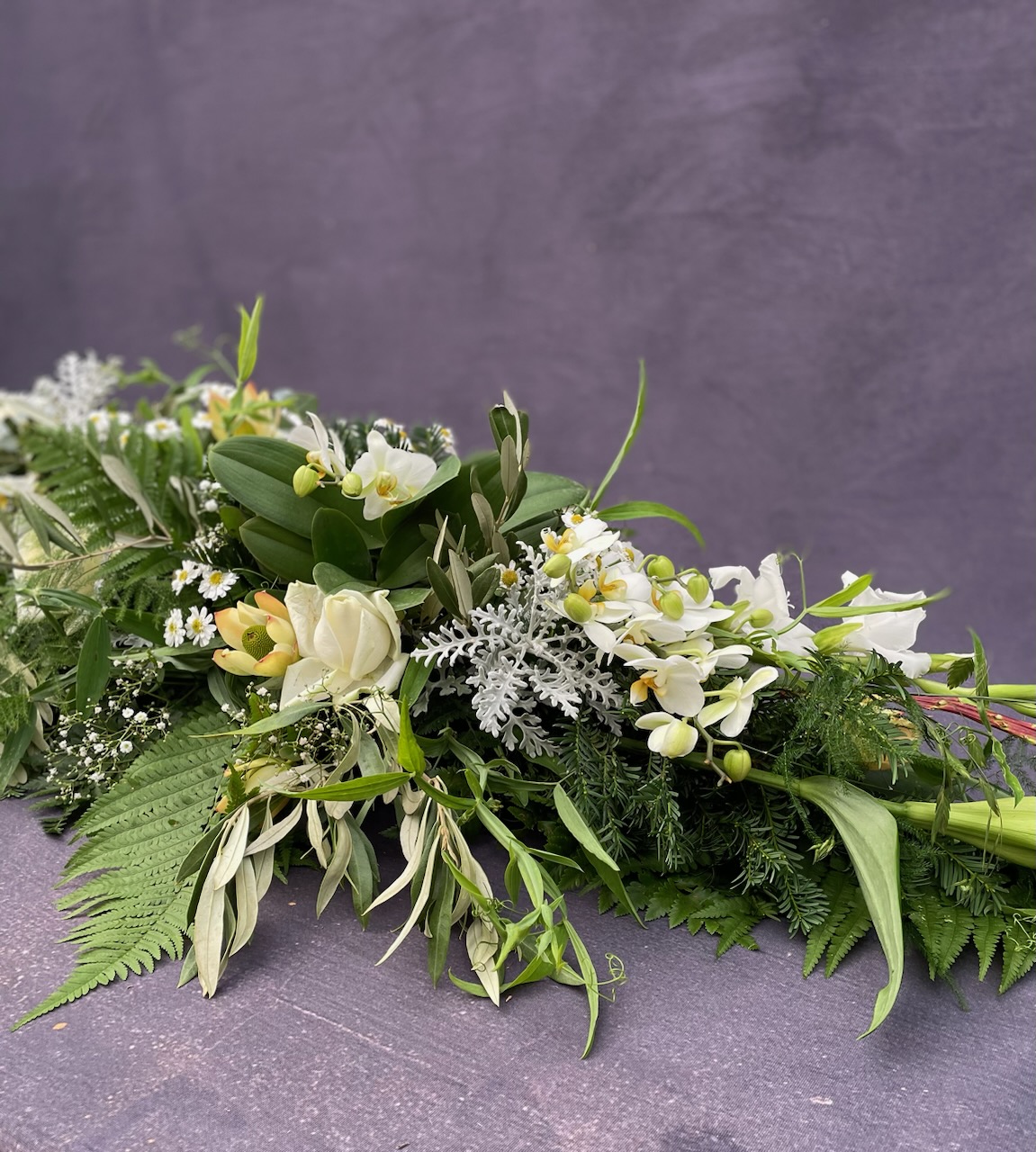 Vi binder med sæsonens blomster og grønt. Kistepynten på billedet er derfor kun et eksempel på en smuk afsked. Skulle det forekomme, at du har et ønske til en blomst udenfor sæson, så finder vi altid et godt alternativ.