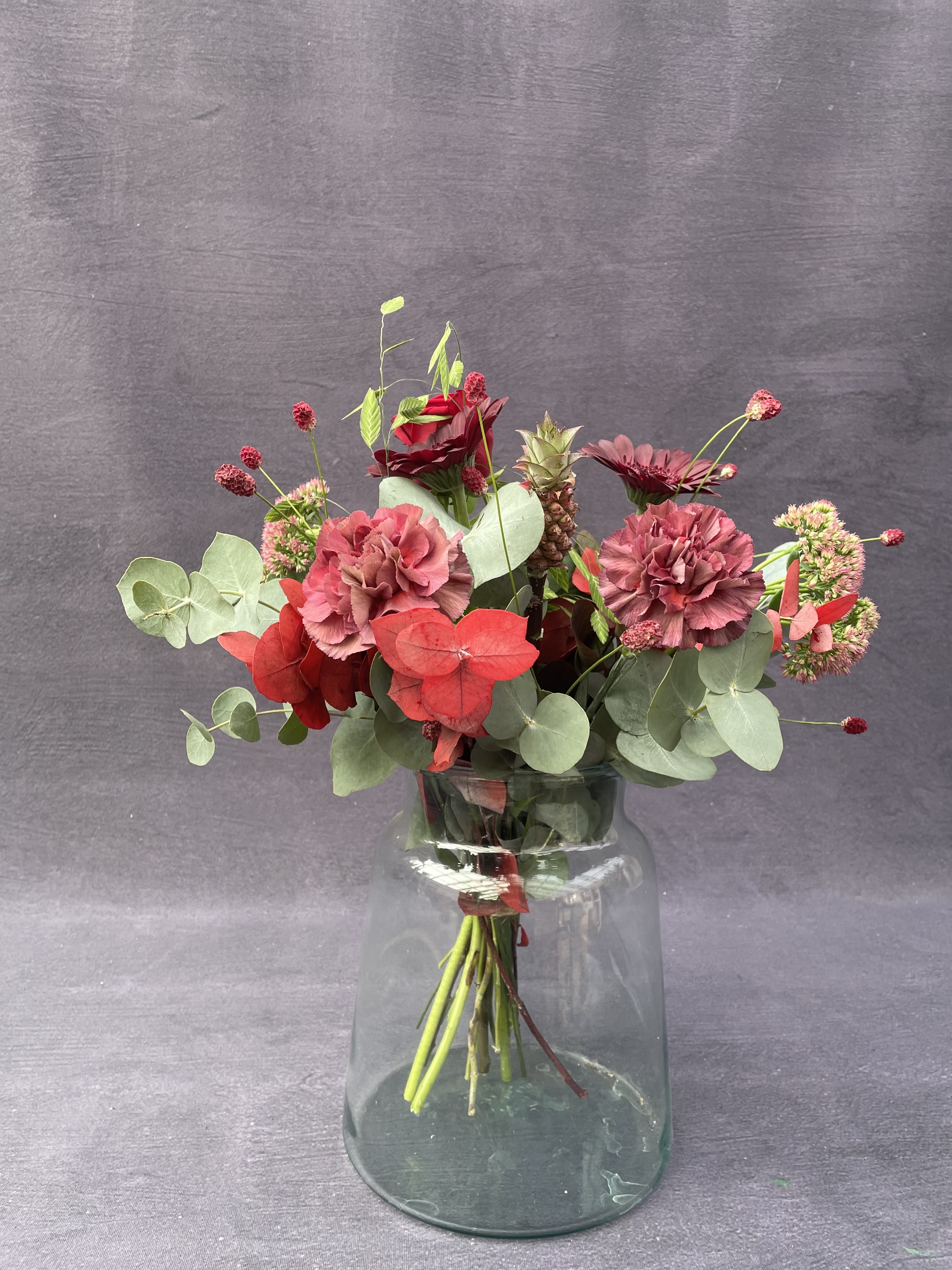 Der kan forekomme andre alternativer til viste blomster på billedet. Vi binder med sæsonens blomster og billedet er derfor blot til inspiration. Dette giver et unikt udtryk til det færdige binderi.
