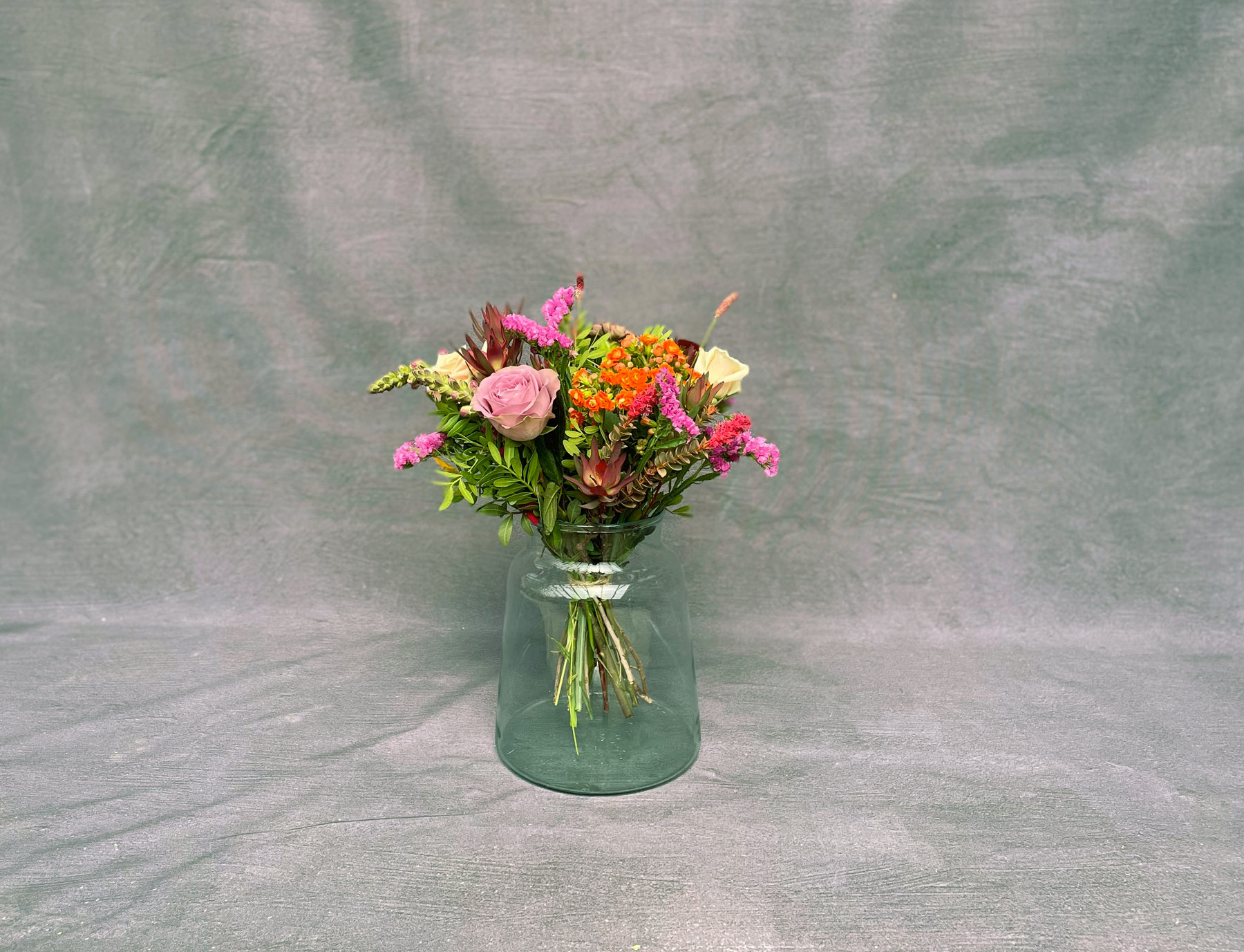 Der kan forekomme andre alternativer til viste blomster på billedet. Vi binder med sæsonens blomster og billedet er derfor blot til inspiration. Dette giver et unikt udtryk til det færdige binderi.