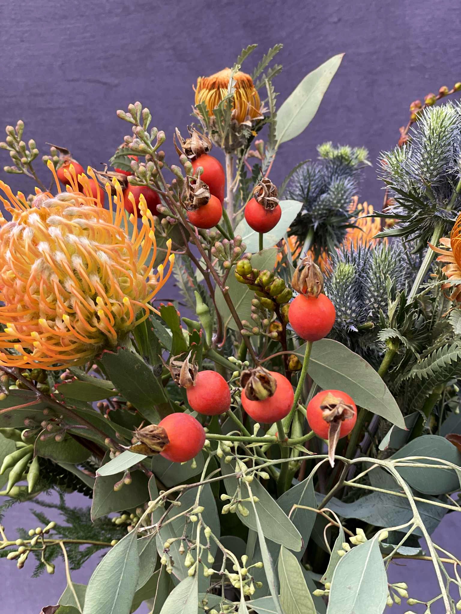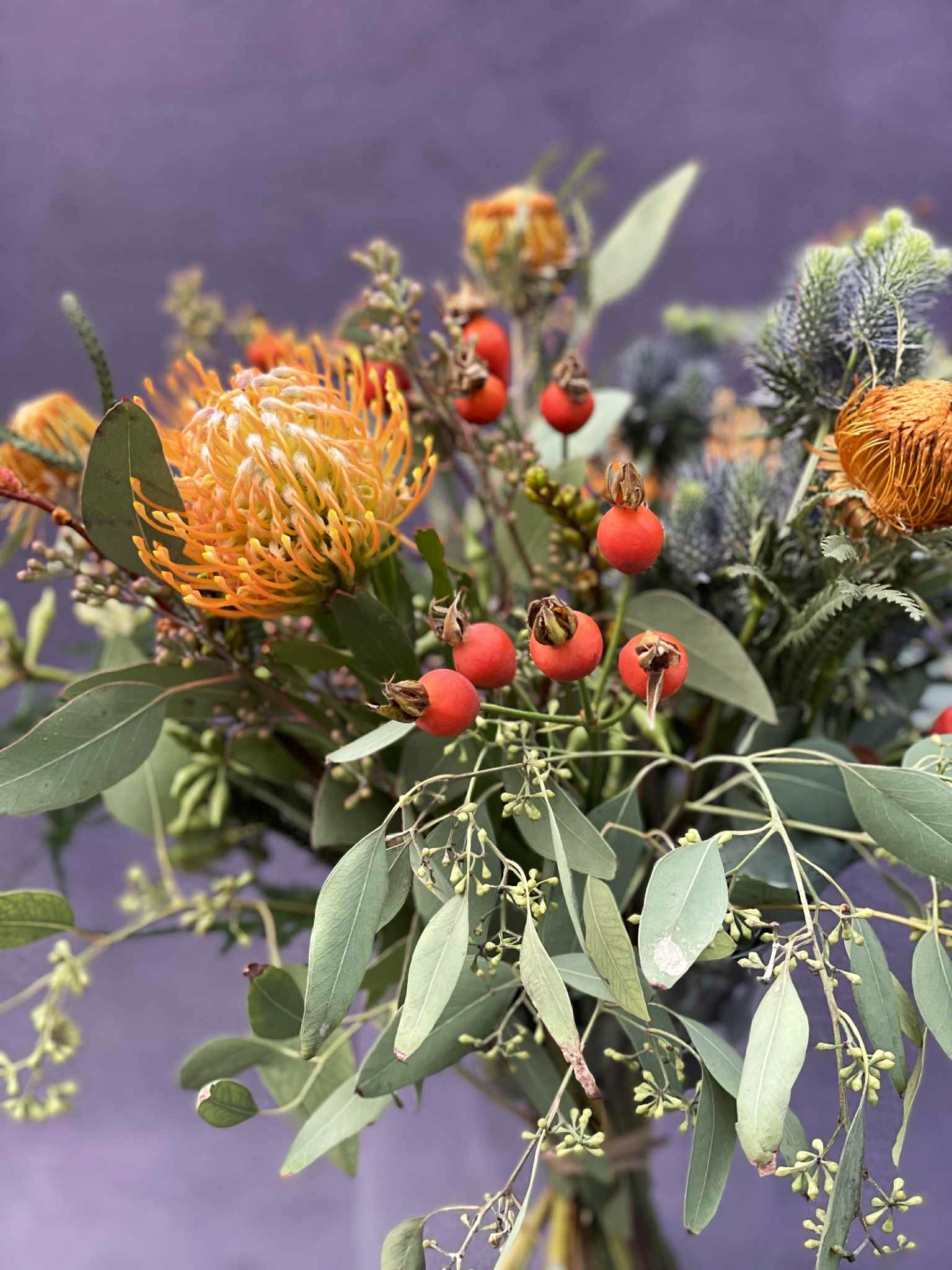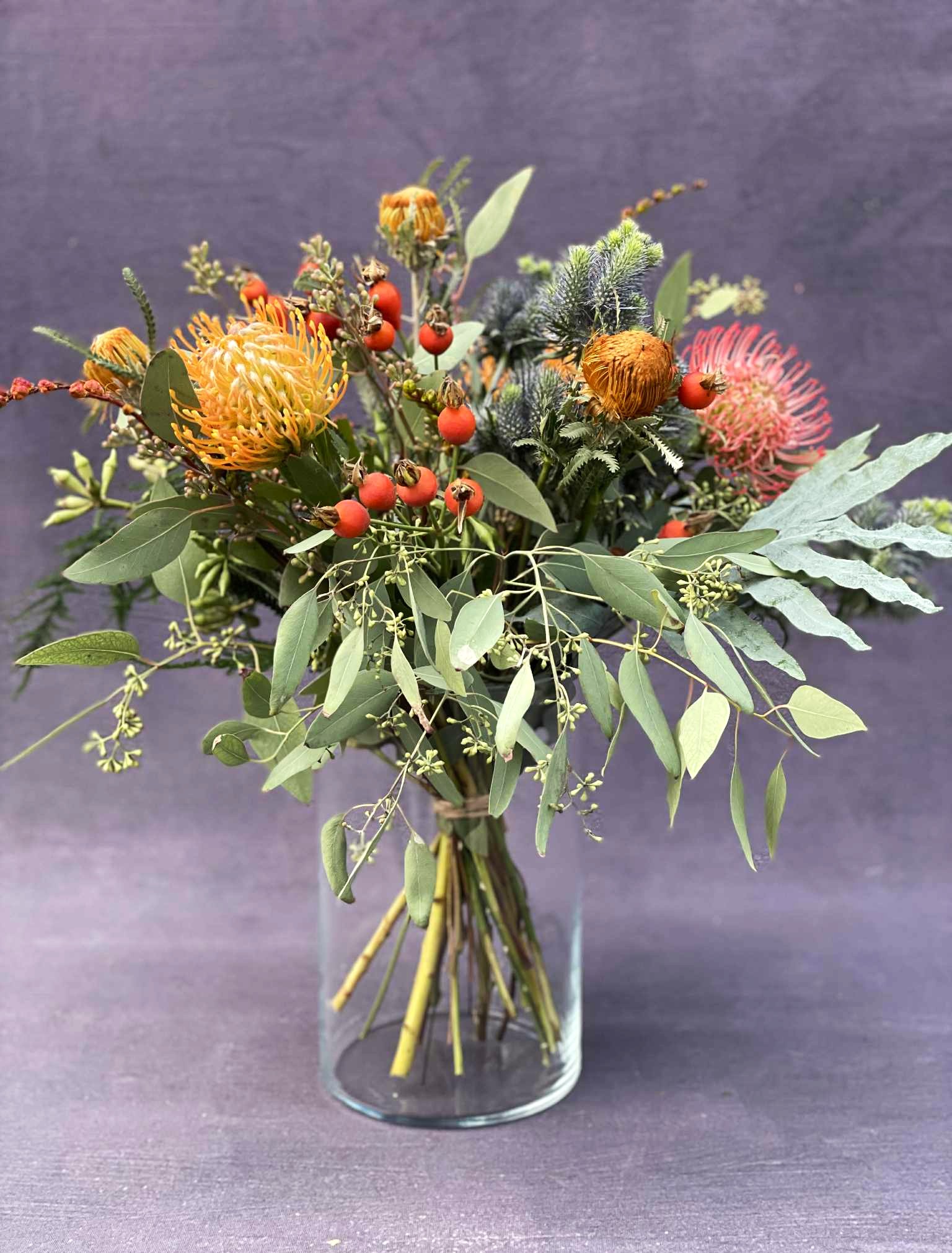 En sprudlende og varm efterårsbuket! For det opmærksomme øje finder man i denne buket en skøn kombination af forskellige overflader, og et legende liv i de mange former. Udtrykket holdes i de varme nuancer og afspejler den smukke årstid.
