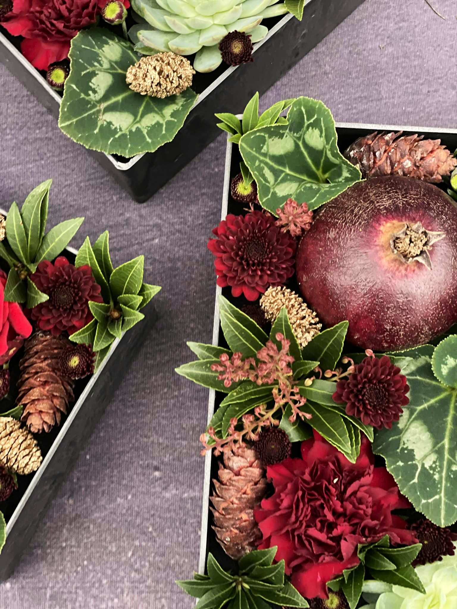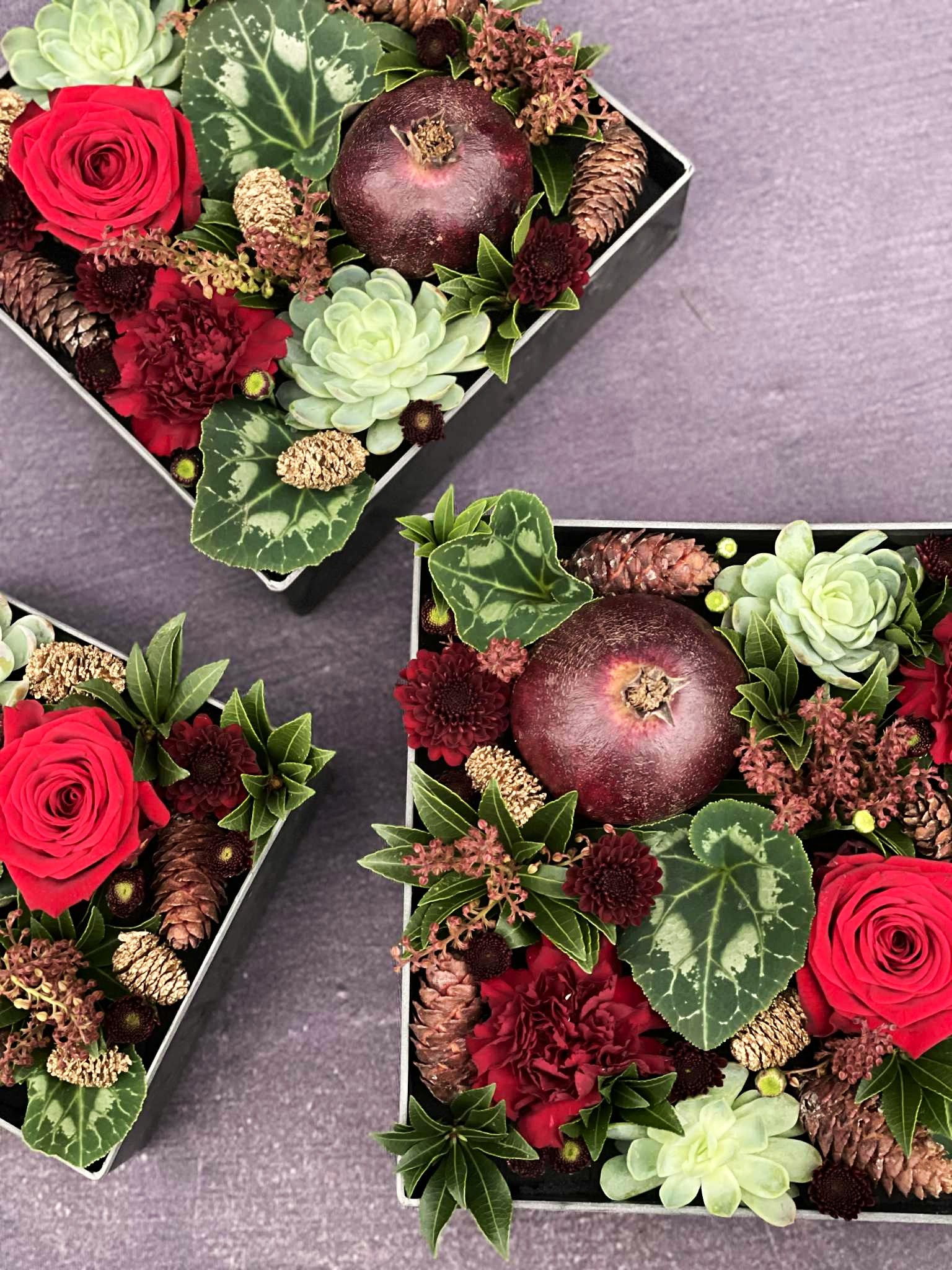 Cozy signatur box. Er den ikke bare hyggelig! Den spreder julen i hjemmet og er en sand glæde for den heldige modtager. Den dekoreres i grønne, røde og bordeaux farver, samt pyntes med det smukkeste vintergrønt.