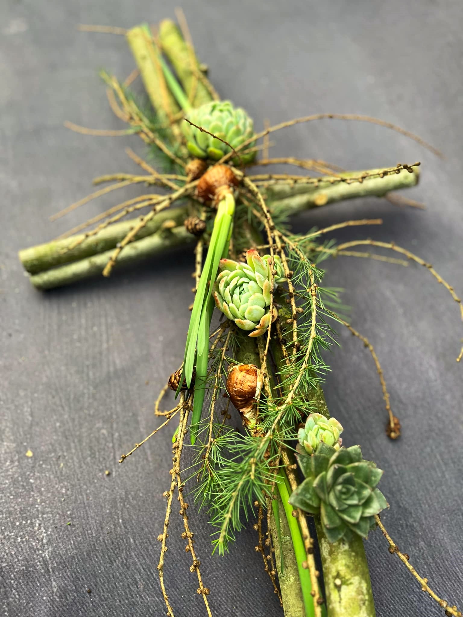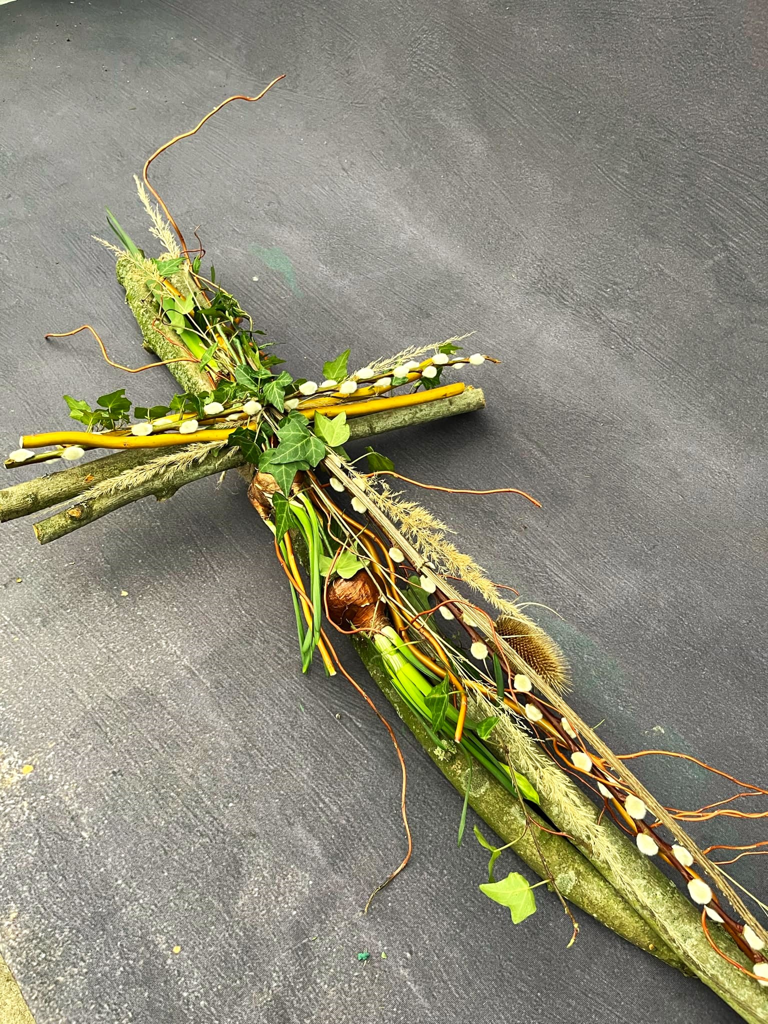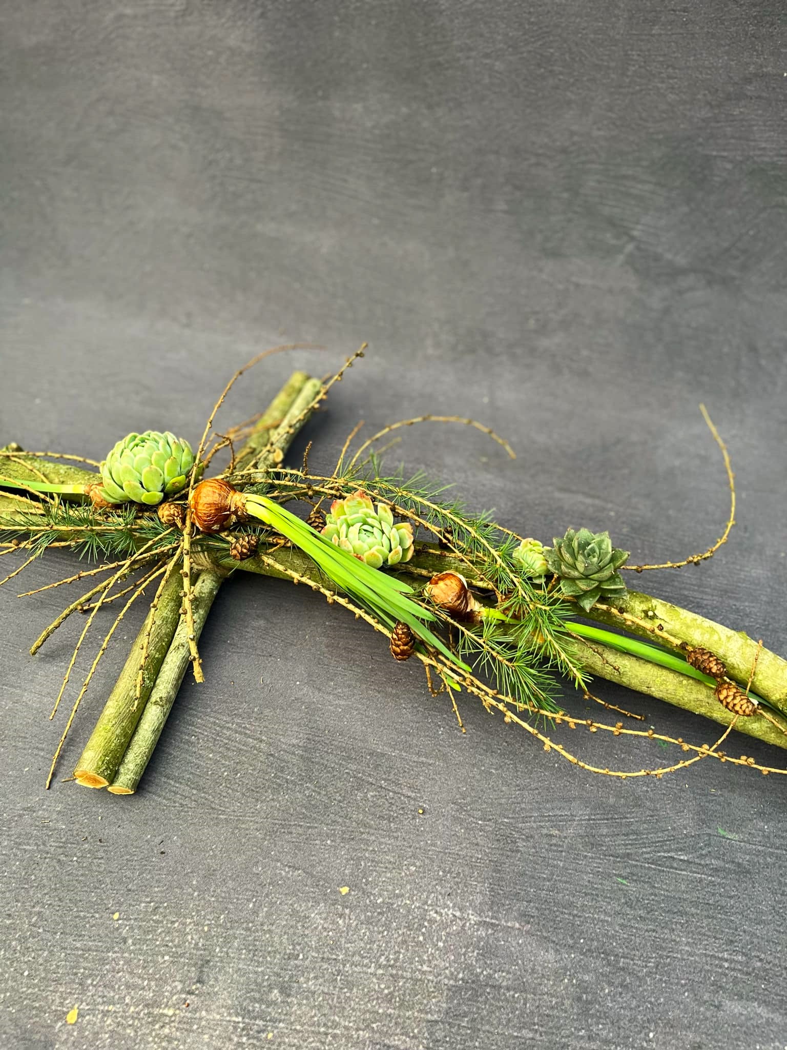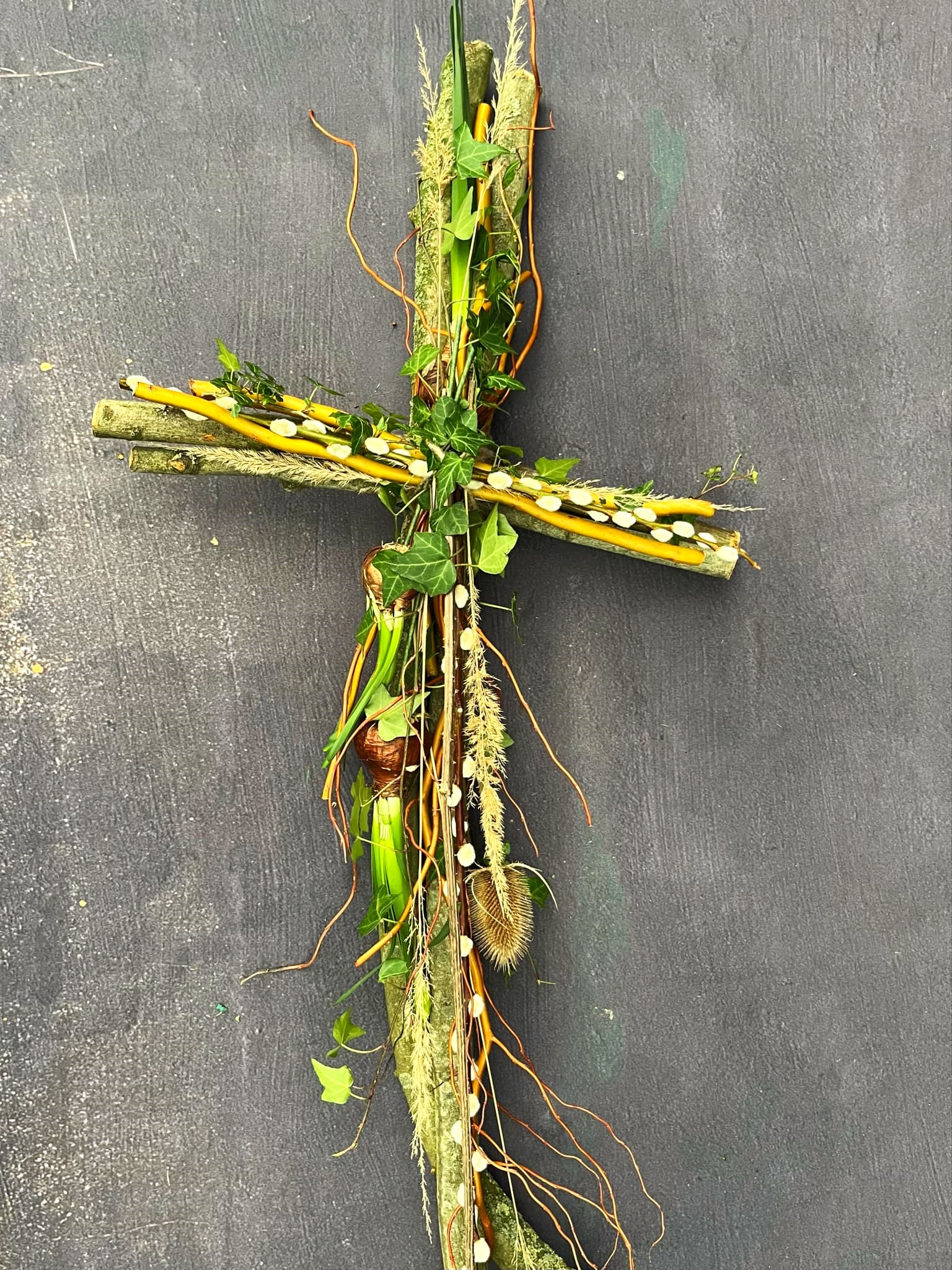 Bestil et smukt kors som det sidste farvel. Korset er lavet i naturmaterialer efter årstiden, og vil derfor være et meget unikt binderi hver gang. Korset vil bindes i en flot og opsigtsvækkende længde på ca. 118 cm og en bredde over midten på ca. 47 cm.