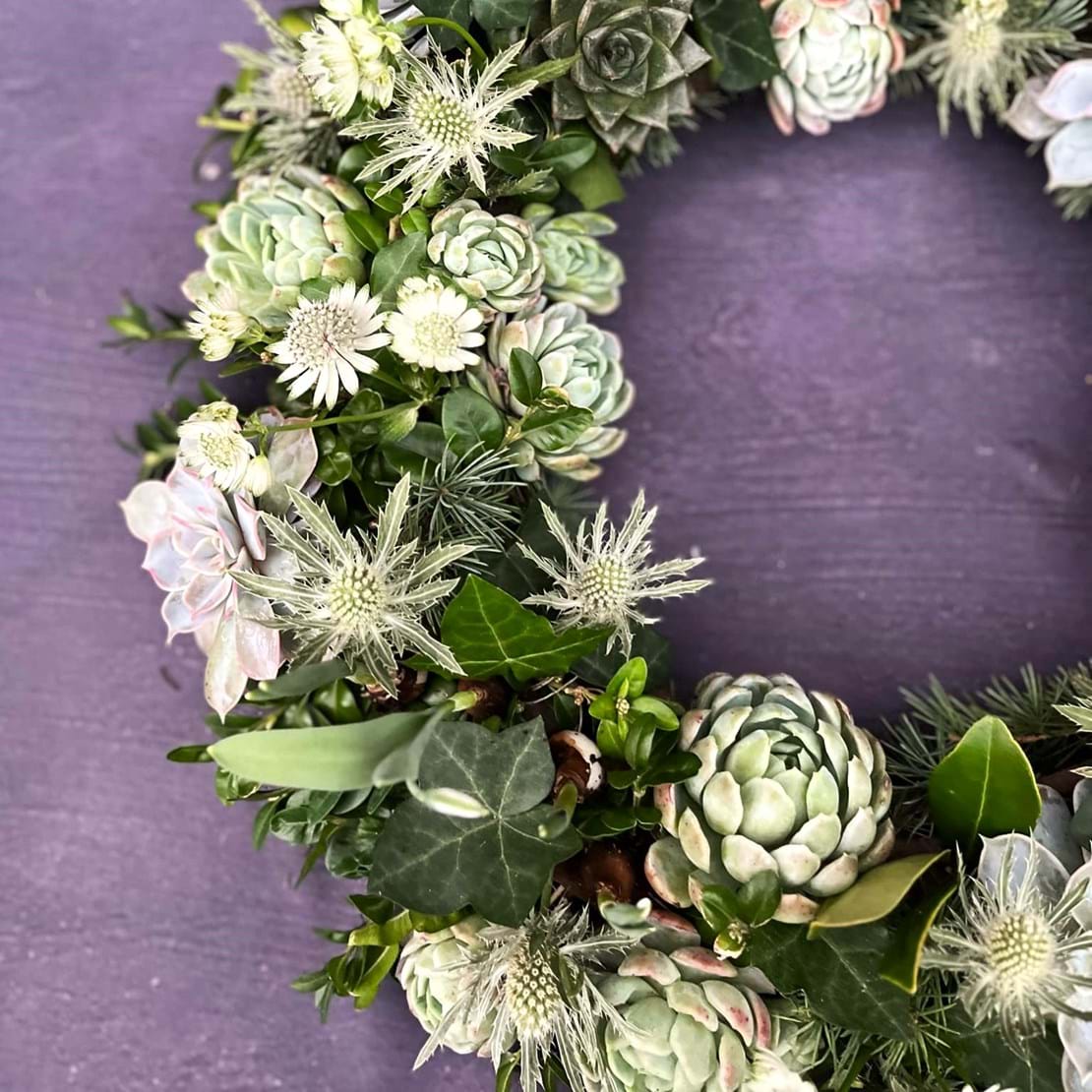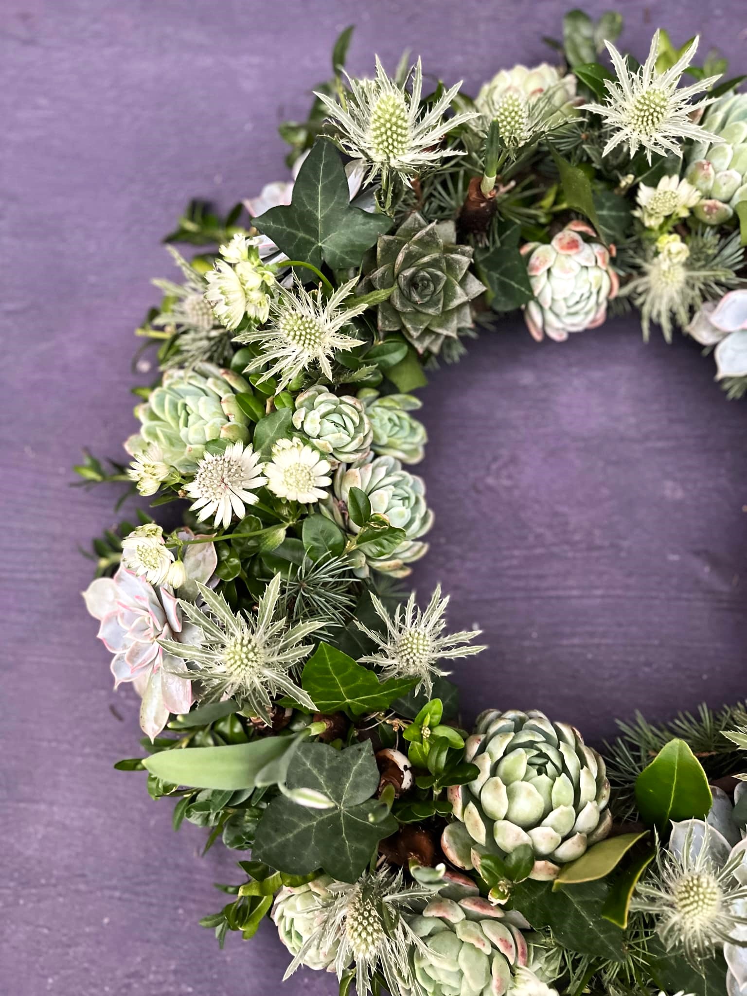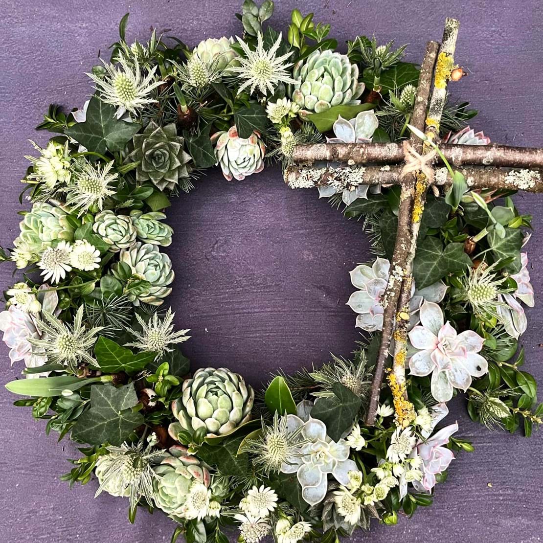 En smuk krans, der er bundet med årstidens grønne naturmaterialer, echeveria og enkelte blomster der er i sæson, er med til at give et rent udtryk.