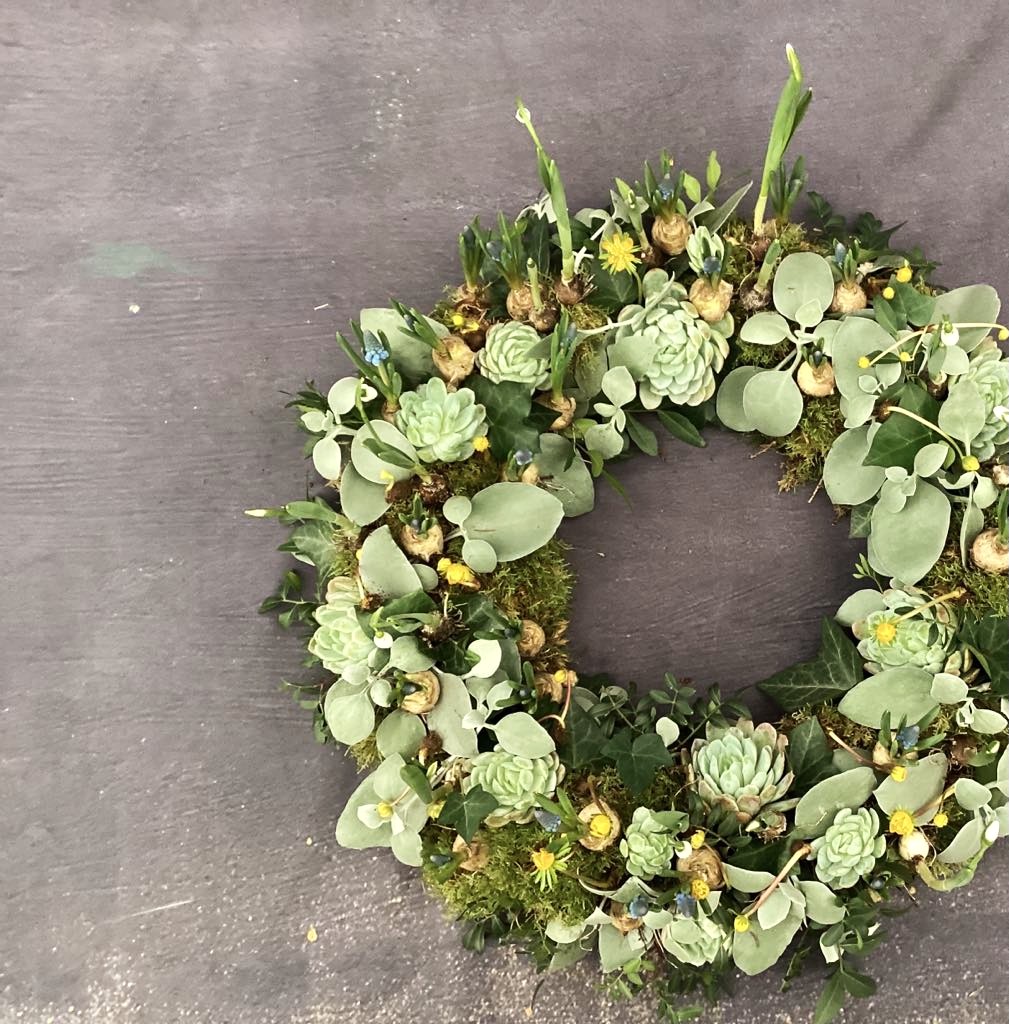 Ønsker du at den sidste afsked skal udtrykke natur og forår, så er vores naturkrans den helt rigtige. Den er bundet med sæsonens friske forårsløg, som er fordelt på en bund af mos og en smuk blanding af grønt.